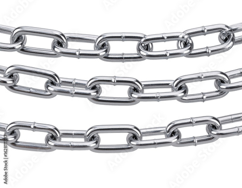 Obraz premium Three connected metallic chains on a white background for commercial use