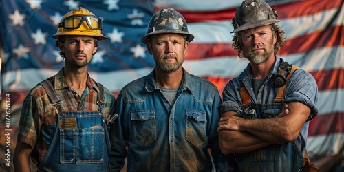 © Larisa, Fototapeta premium Three construction workers in front of US flag