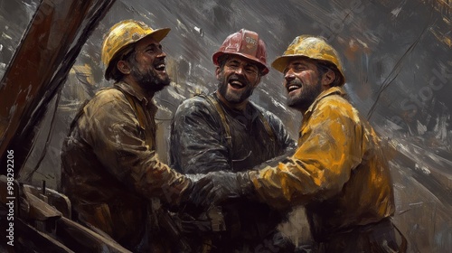 Fototapeta premium Three Construction Workers Laughing Together in Hard Hats