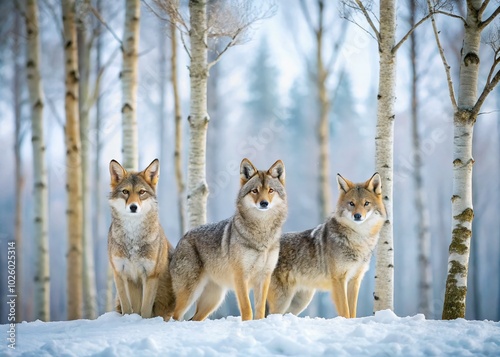 © Four888, Naklejka premium Three Coyotes in Birch Forest - Winter Wildlife Double Exposure Photography