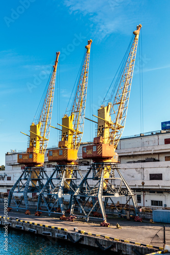 © Scott Prokop, Fototapeta premium Three cranes are standing on a dock, with one crane being the tallest