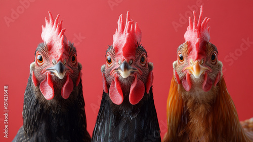 © qazi, Naklejka premium Three curious chickens boldly posing with vibrant red combs and wattles showcasing farm life with a minimalist red