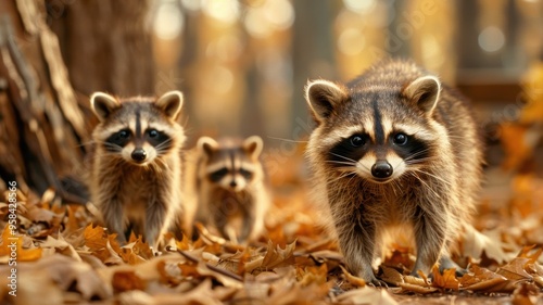 Fototapeta premium Three curious raccoons explore a forest floor covered in autumn leaves,...