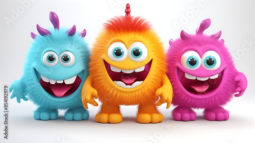 Fototapeta premium Three cute and colorful monsters are standing in a row. They have big eyes, toothy smiles, and furry bodies.