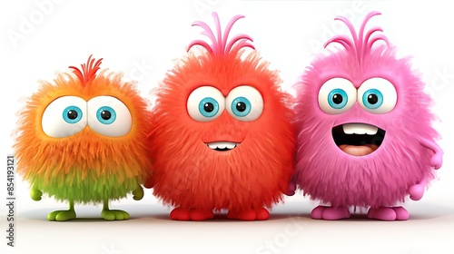 Fototapeta premium Three cute and colorful monsters standing in a row on a white background. They have big eyes, furry bodies, and happy expressions.