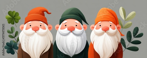 © Georgii, Obraz premium Three cute bearded garden gnomes in colorful hats with clovers - flat vector illustration