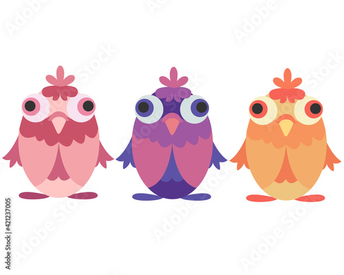 Fototapeta premium three cute birdies in the form of eggs with big eyes, easter