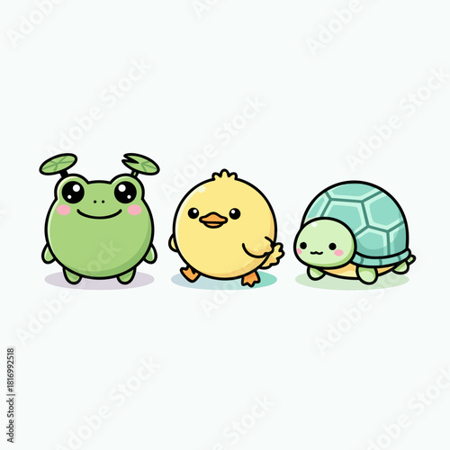 Fototapeta premium Three cute cartoon animals: a frog, a chick, and a turtle, depicted in a...