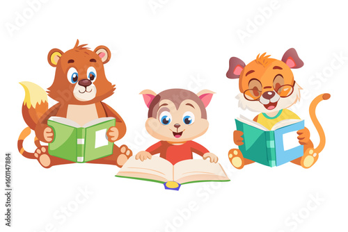 © Md, Naklejka premium Three cute cartoon animals reading books together on a black background