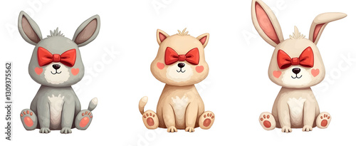 Fototapeta premium Three cute cartoon animals with bows, featuring a bunny, cat, and rabbit, all...