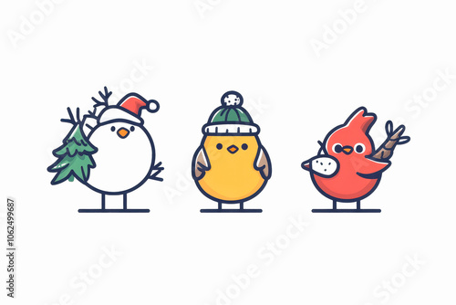 © Supranee, Obraz premium Three cute cartoon birds dressed for winter with festive accessories.