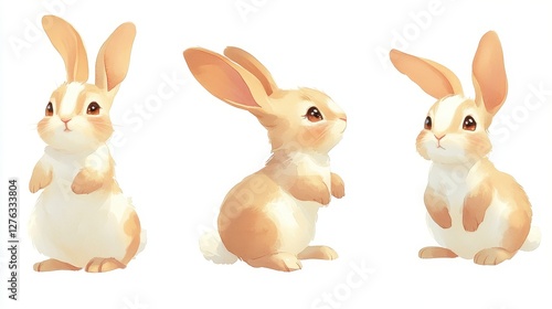Fototapeta premium Three cute cartoon bunnies sitting side by side with big ears and fluffy tails