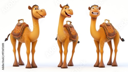 Naklejka premium Three cute cartoon camels with saddles stand on a white background, looking...