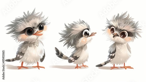 © pakbung, Fototapeta premium Three cute cartoon kookaburra birds with big eyes and fluffy feathers.