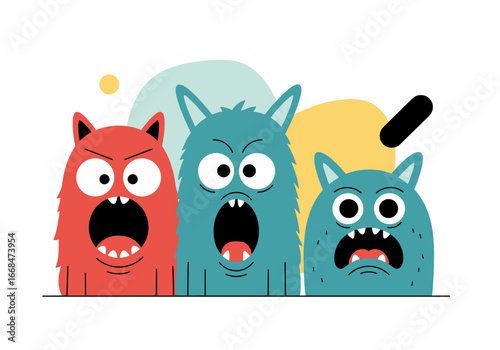 © Emran, Naklejka premium Three cute cartoon monsters with big mouths expressing different emotions together on a white background