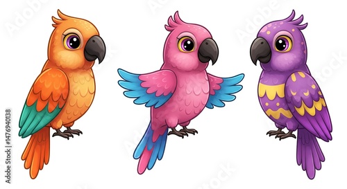 Fototapeta premium Three Cute Cartoon Parrots Illustration Set