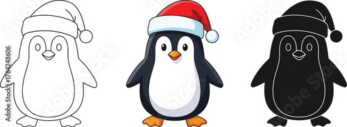 Obraz premium Three cute cartoon penguins wearing Santa hats