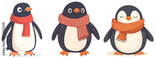 © Kanimalia, Fototapeta premium Three Cute Penguins Wearing Scarves. Collection Set Illustration.on transparent, white background, isolate PNG