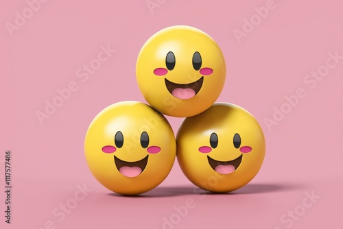 © Dmitriy K., Fototapeta premium Three 3D rendered smiling emojis stacked in a triangle on a pink background