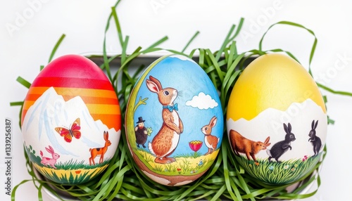 © Mongkol, Fototapeta premium Three Decorated Easter Eggs With Whimsical Designs for Spring Celebration