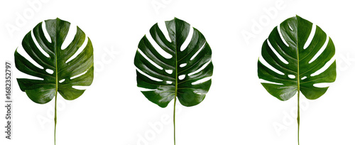 © Noriba, Naklejka premium Three deep green, ornate monstera leaves against a black background