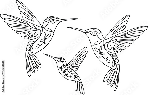 © NEWJ, Fototapeta premium Three delicate hummingbirds in flight artistic sketch nature wildlife fauna