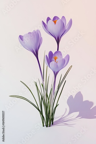 © Cendana, Naklejka premium Three delicate, light purple crocus flowers bloom amidst a tuft of grass. Soft shadows suggest light source