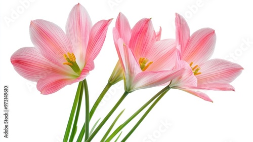 © BerkahStock, Naklejka premium Three delicate pink flowers with green stems against a white background.