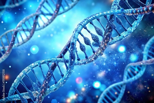 © Arnada, Fototapeta premium Three Diagonal DNA Chains with Digital Code on a Blue Background Representing the Future of Medicine and Genetic Research in 3D Rendering