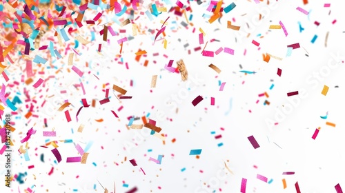 Fototapeta premium Three-dimensional rendering of a multicolor confetti abstract background, with a lot of falling pieces and a white background. Festive decorative tinsel element for a design.