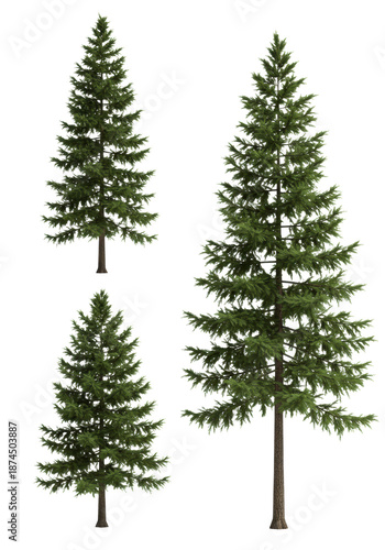 © Sung, Fototapeta premium Three distinct photorealistic 3d model fir trees with detailed green needles and slender trunks, against a transparent studio background, architectural asset visualization concept