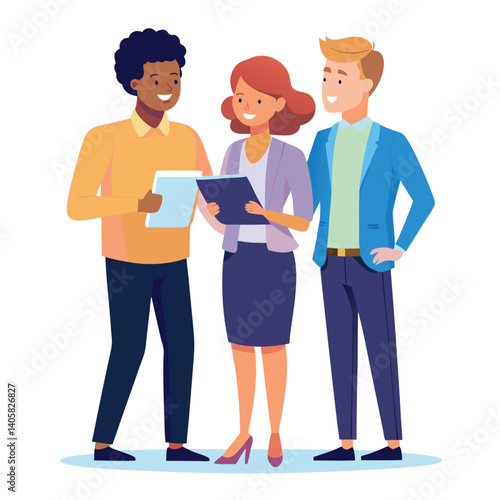 © MDSAZIB, Fototapeta premium three-diverse-business-partners-standing-and-discus vector image on white background