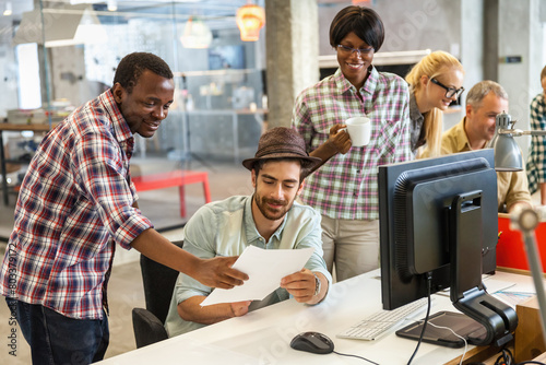 © Geber86, Obraz premium Three diverse colleagues discussing project with documents in modern office