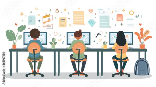 © LittleDreamStocks, Fototapeta premium Three diverse people using laptops with headphones.