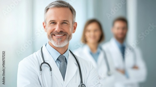 © KayKai, Fototapeta premium Three doctors are posing for a photo in a white lab coat