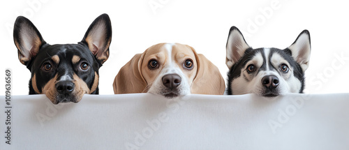 Obraz premium Three dogs peeking over a white surface, white isolate background.