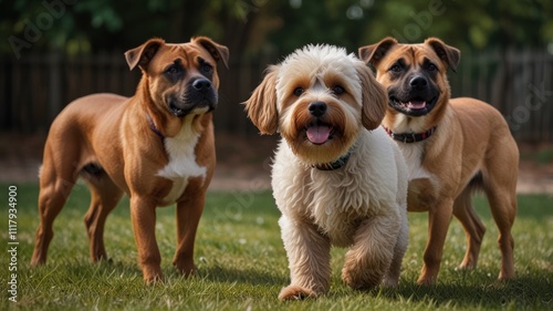 © Syarif, Obraz premium Three dogs, two fawn Staffies and a fluffy Cockapoo, standing in a grassy park.