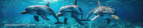 © Alokya, Obraz premium Three dolphins gracefully swimming underwater.