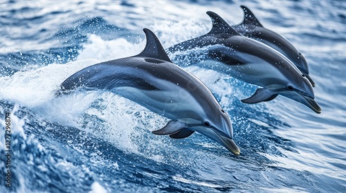 © Ariestia, Fototapeta premium Three Dolphins Leap Through Ocean Waves