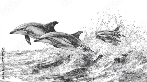 © mila103, Obraz premium Three dolphins perform acrobatic leaps over crashing waves in a vibrant ocean setting.