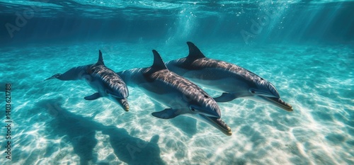 © Dwiwahyu, Fototapeta premium Three dolphins swim in shallow turquoise ocean, sunny day, travel poster