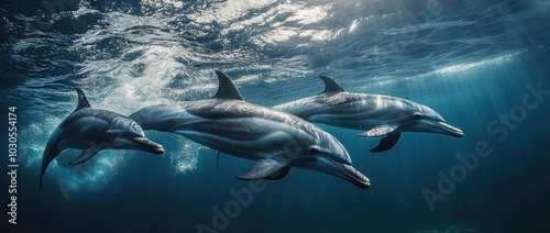 © BerkahStock, Obraz premium Three dolphins swimming gracefully in the ocean, illuminated by sunlight filtering through water.