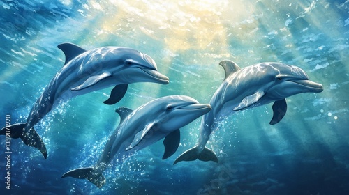 © Karo, Fototapeta premium Three dolphins swimming in the ocean underwater.