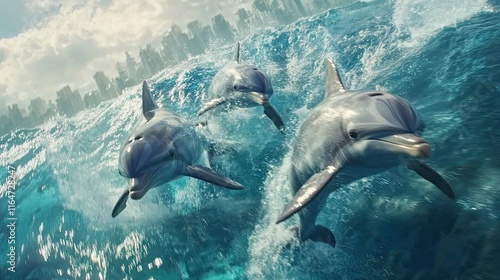 Fototapeta premium Three Dolphins Swimming Through Ocean Waves Near City