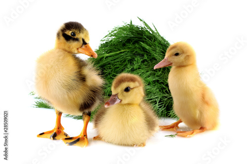 © Africa Studio, Fototapeta premium Three ducklings on green grass background isolated on white