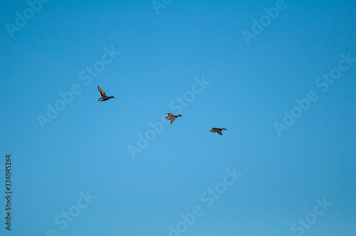 © cesc92, Obraz premium Three ducks flying in the blue sky