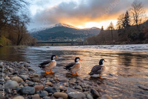 © Vistara , Naklejka premium Three Ducks Walking Along a Tranquil Riverbank at Sunset with Majestic Mountains in the Background Reflecting Serenity and Natural Beauty