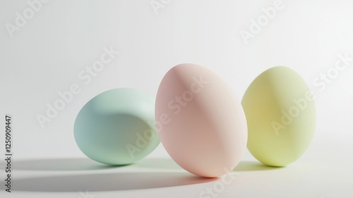 © Enigma, Fototapeta premium Three easter eggs in soft pastel colors - mint green. Peachy pink. And pale yellow - arranged in a row on white surface. Minimalist composition with subtle shadows creates elegant holiday atmosphere