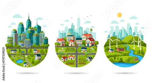 Obraz premium Three ecological communities showing green energy, urban development, and...