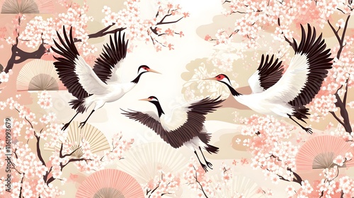 © Jojo*, Obraz premium Three Elegant Cranes Soaring Amidst Cherry Blossoms